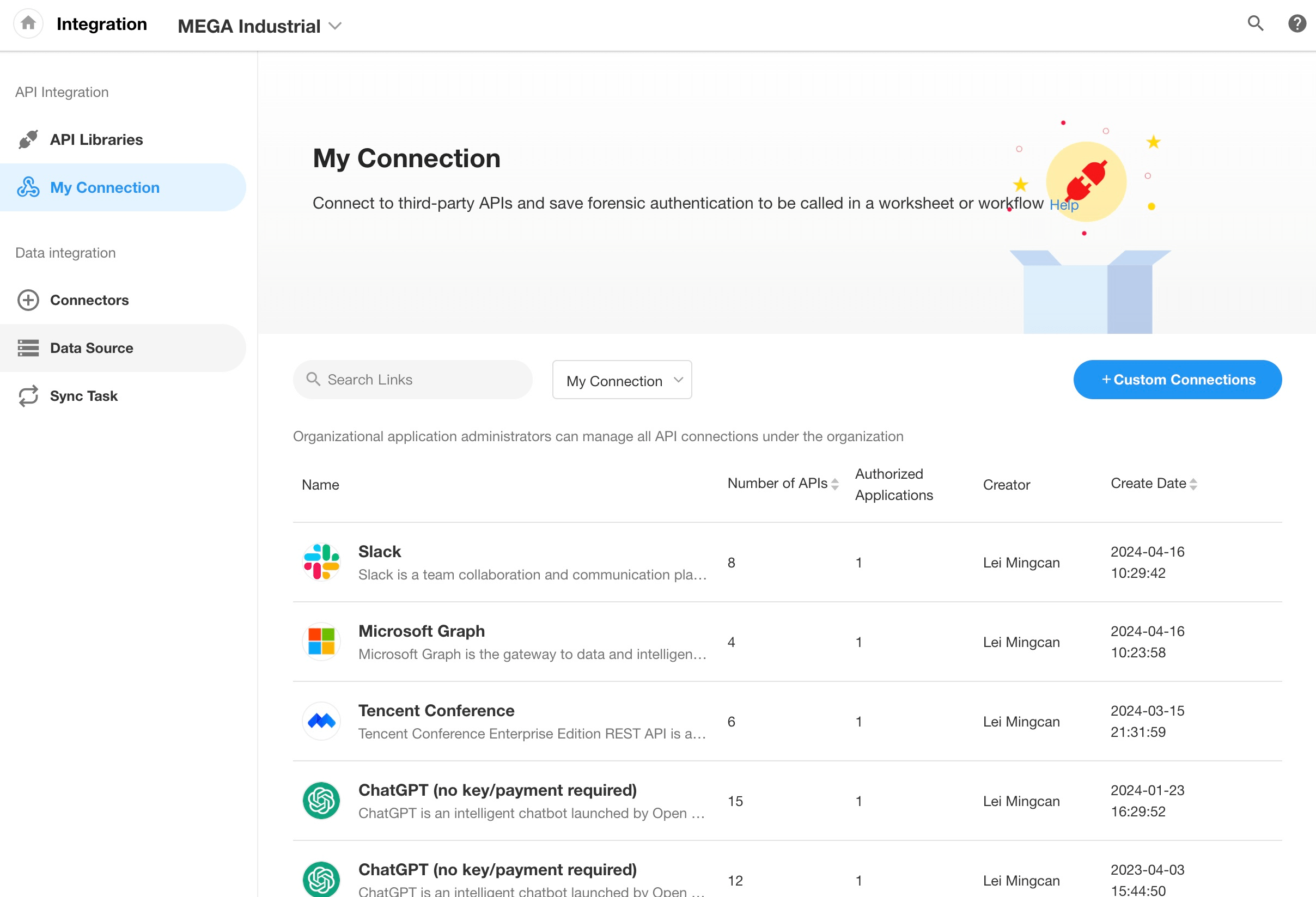 Support custom connection with any APIs. Authorize calling by different apps without coding.